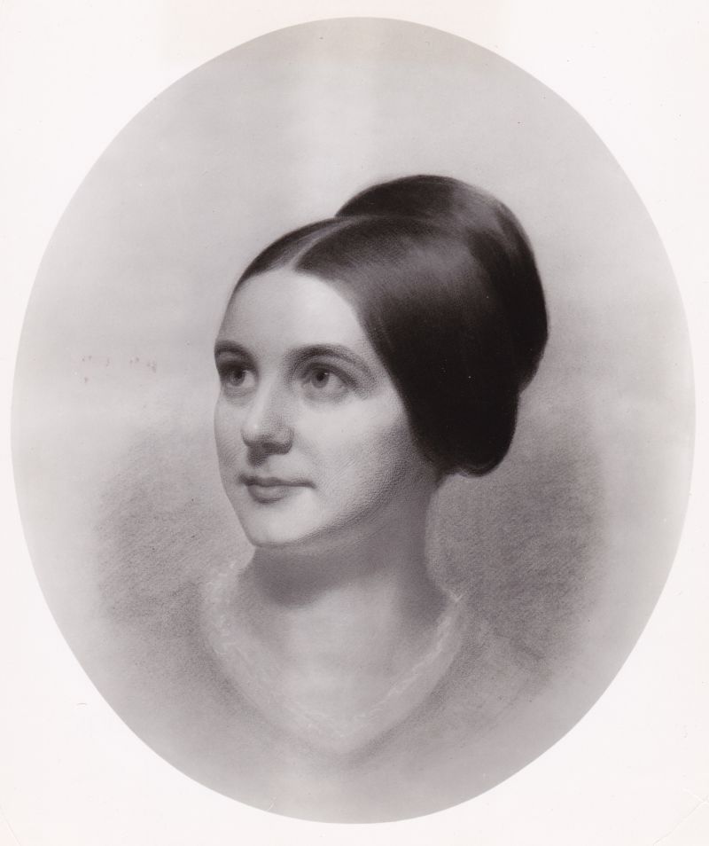 Johnson's earliest recorded portrait drawings of women are dated 1845: his portrait of Dolley Madison that indicates the setting and one of his older sister Judith which shows head and neck only. Unlike the portraits of men, his portraits of women are softer in light-dark chiaroscuro and do not exhibit the muscular structure of the face as do those of men. Johnson consolidated his draughtsman’s talents during his sojourn in Boston, where he painted Henry Wadsworth Longfellow and his circle. He took about three days to complete a charcoal portrait. The style of the time was to present portraits in oval frames.