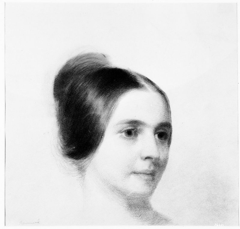 Johnson's earliest recorded portrait drawings of women are dated 1845: his portrait of Dolley Madison that indicates the setting and one of his older sister Judith which shows head and neck only. Unlike the portraits of men, his portraits of women are softer in light-dark chiaroscuro and do not exhibit the muscular structure of the face as do those of men. Johnson consolidated his draughtsman’s talents during his sojourn in Boston, where he painted Henry Wadsworth Longfellow and his circle. He took about three days to complete a charcoal portrait. The style of the time was to present portraits in oval frames.